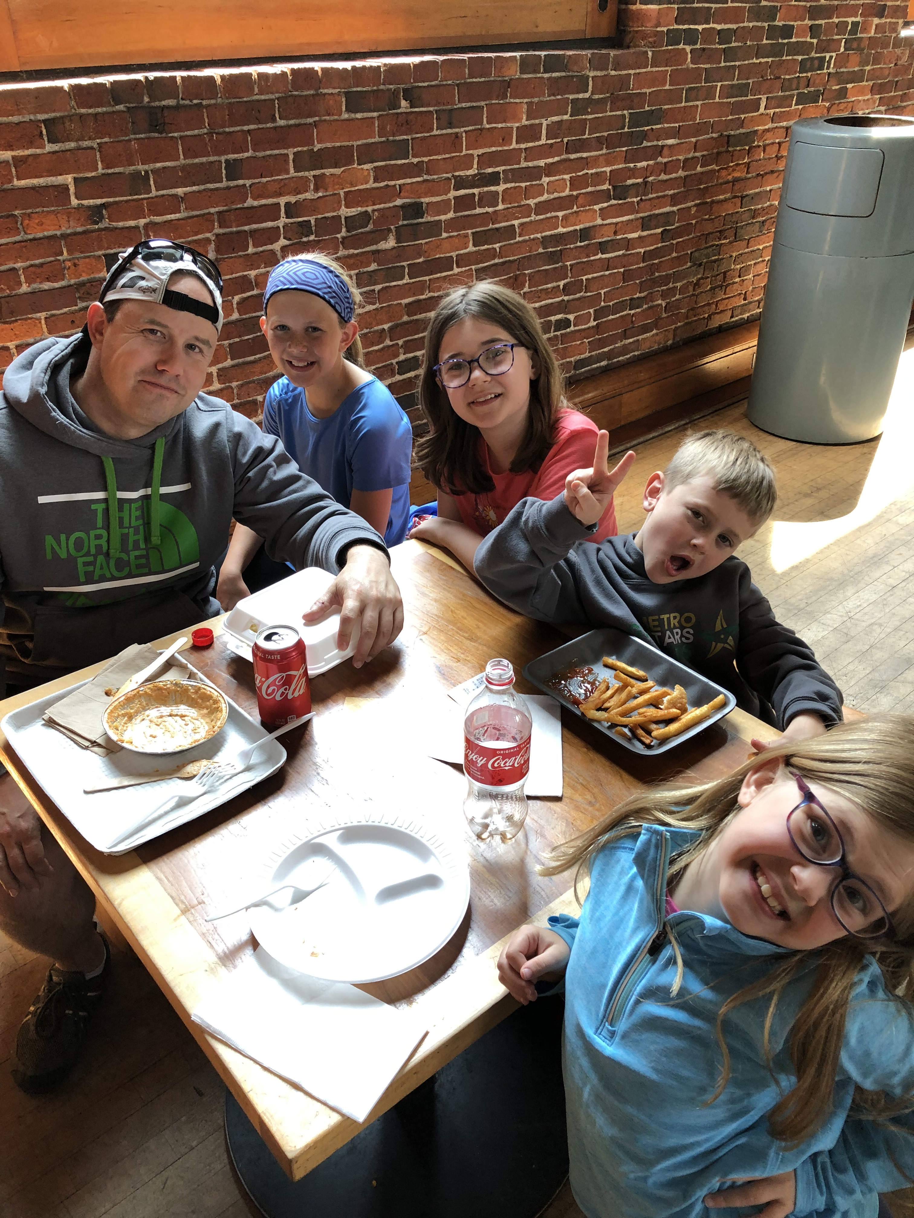 What to do on an 8 hour layover? Head into the city of course. The first issue to solve was what to do with the luggage as there are no lockers at the airport! Erik had a brilliant idea and called the Hilton Hotel and they offered to hold the luggage – perfect! We called our Uber and headed downtown. We dropped off the luggage – easy peasy and walked a few blocks to Quincy Market. The kids loved the idea of a food court and picking their own lunch. Thank goodness Qunicy Market has as much variety as my children’s tastes! Quesadilla, Japanese teriyaki chicken, chicken strips, and lobster pie for the win! With full tummies we headed over Faneuil Hall for a history lesson. We figured it was important to learn both sides of American History so we filled their heads with important facts of the revolution. There’s always 2 sides to a story so we’ll learn the British side later 🙂 Samantha particularly loved learning about the printing press. Then we walked the area to find Paul Revere’s House. We learned a bit about Paul and his famous ride. The extremely tired children decided Paul wasn’t quite interesting enough and were soon ready to move on. Luckily around the corner we found delicious gelato (thank goodness there’s a strong Italian representation in Boston!). The children were revived with gelato and wanted to play at the park. So we walked a ways and found the Frog park in the center of Boston. As the children played (and Katie chased some squirrels) we strategized our dinner plan. Pizza is always a favorite so we found a pizza place and each ordered a slice – or so we thought! Evidently at this place every slice is a quarter of a pizza (I thought he said “three and a quarter for the slice”). Ooops – too much food so we shared with the homeless man outside the shop (for real!). We had full bellies and tired feet so it was time to head back to the airport. After a quick walk back to Hilton to grab our bags (thanks Hilton!) we caught an Uber back to the airport.