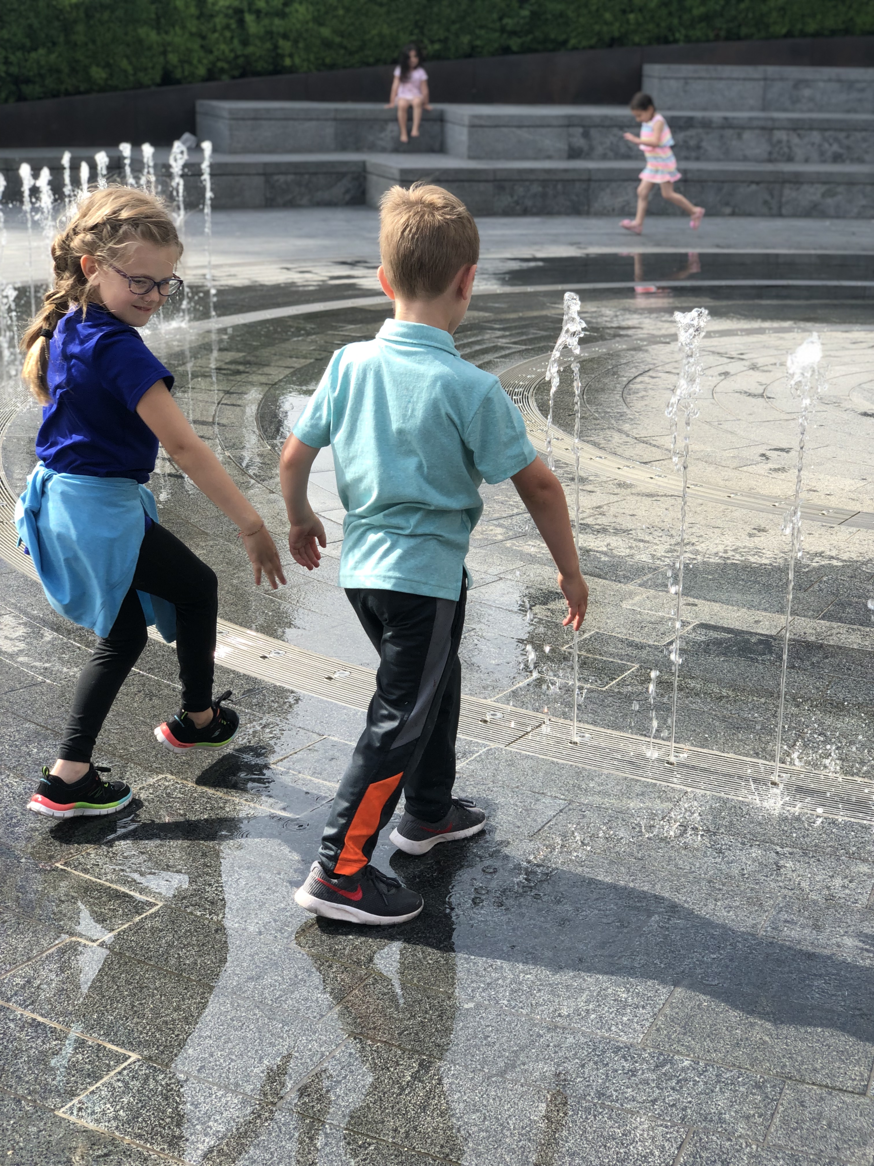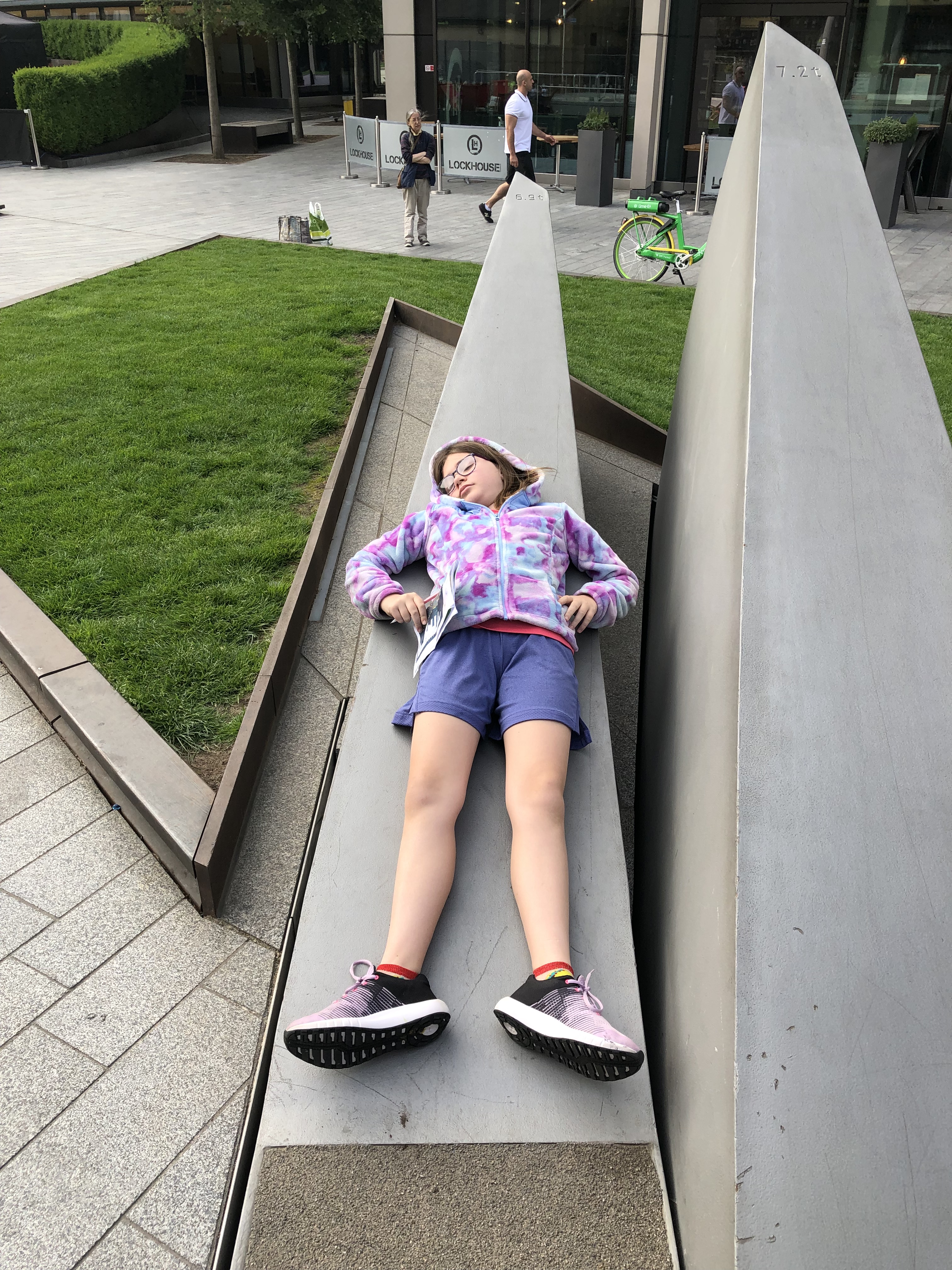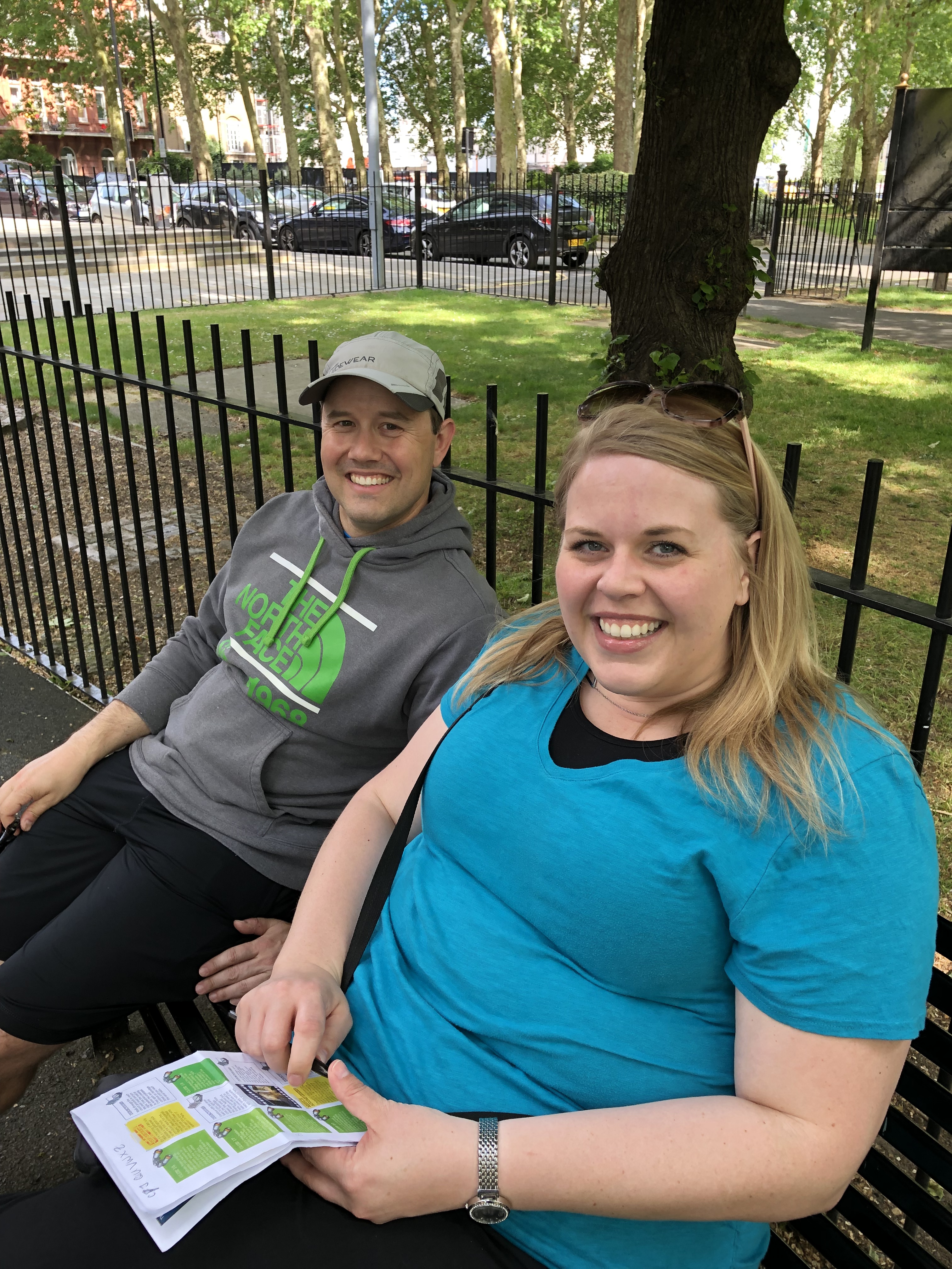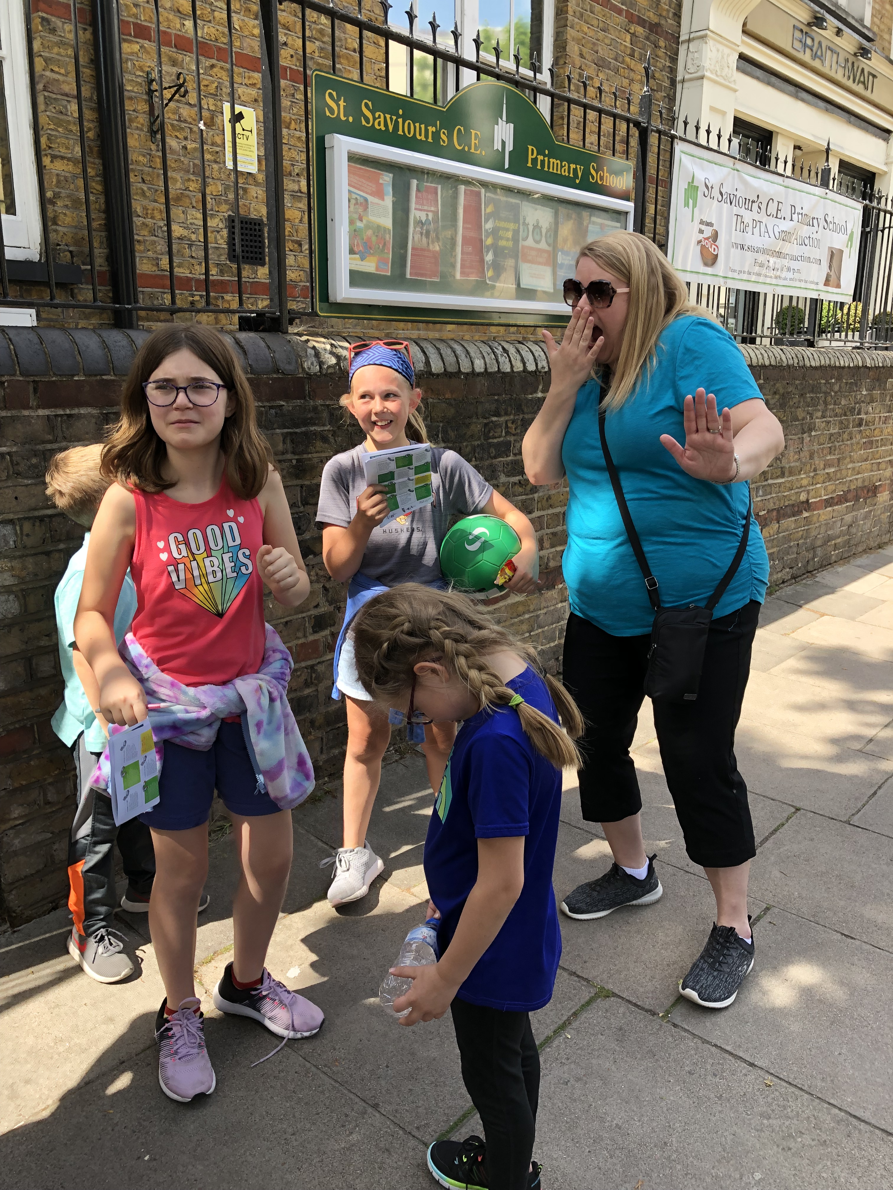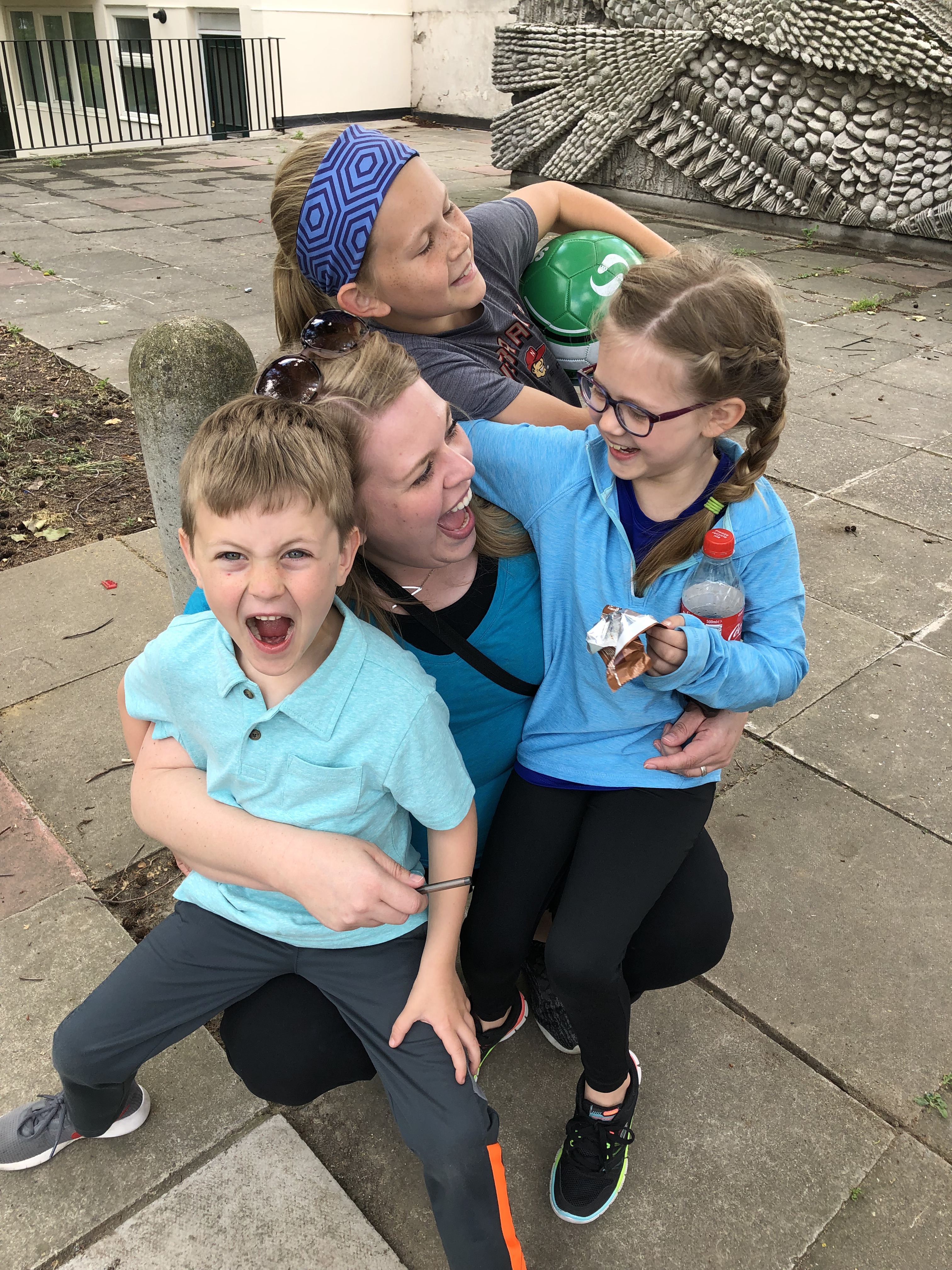 It was about this time we discovered another family following this trail. GAME ON – Nothing like a little competition to speed things along. We quickly made our way to the next stop and while Alyssa solved it (do you see a theme here?) the kids found a playground to explore! Juliette challenged Duncan to yet another game of football. The other family arrived, quickly solved the clue and moved on – game over for us! Even if we didn’t beat them we were determined to finish! We found another clue, then another, then a M&S. In Alyssa’s words the M&S is “a posh convenience store.” It was here she introduced us to “Percy Pigs” a lovely little gummy treat! We found our way to a new area complete with a fountain to play in. Could this day get any better?!?