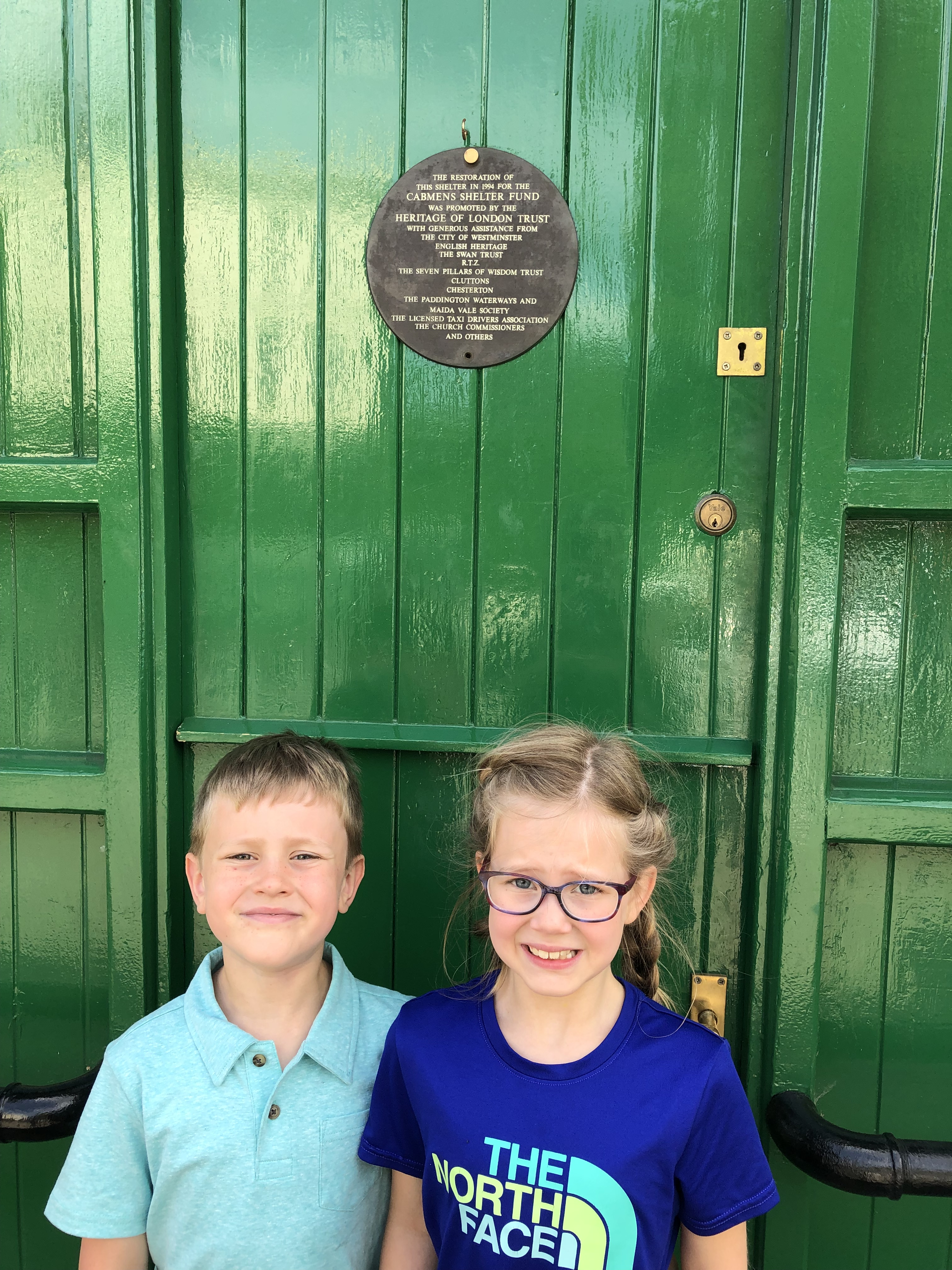 We kept at the map and started solving clues 4,5,6. It was about this time that Charlie started a tour of his own, “Bathrooms of Little Venice.” We kept searching for our trail while Liz helped Charlie tour the bathroom 😊 Our trail led us through a park so of course we had to stop and explore! This gave the adults some time to catch up while the children played. After a bit we were all getting hungry so we explored our options. It was here that Charlie took his 2nd stop on the bathroom tour – down a “dungeoness” staircase (the employee’s words not mine!). Somehow he and I made it back out of the dungeon in one piece and we continued our journey. We discovered “The Fish Bar” next door and thought it sounded good (well everyone but Samantha but they can’t all be winners!). We had chicken, fish, and chips (delish!) as well as some plums and tomatoes from the fruit stand next door. A third stop on Charlie’s tour took us to the local “surgery” which is British for hospital clinic! Good to know as sometimes bathrooms are hard to find!
