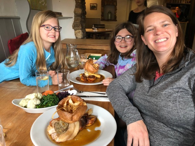 I happened to be reading some top 10 list that was breaking down the things about Britain. Near the top of that list was an item called the “Sunday Roast.” Well it was Sunday, so we better try that out! We returned to The Strode Arms in our little village and basically ordered the menu – the beef, the pork, and the chicken. Each entrée came with mashed potatoes, a side of “veg,” the meat, a Yorkshire pudding, and lots of gravy. As an aside, we’re really not sure about the Yorkshire pudding. On every menu in the UK the puddings are the dessert menu, and a Yorkshire pudding is definitely not a dessert. We’ve asked a few people (in three different countries), and they aren’t able to give us a straight answer. Anyways, its basically a puff pastry in the shape of a bowl that was set on top of our lunch. The Sunday Roast pretty good, but we all agreed it wasn’t our favorite thing ever.
