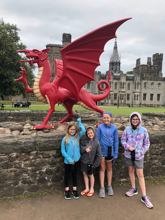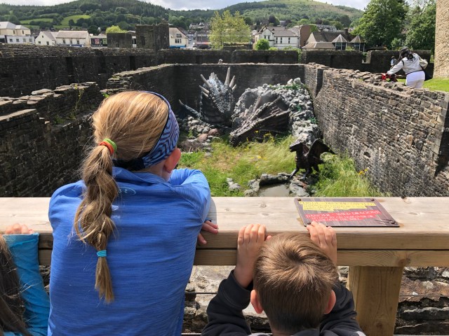 Caerphilly Castle was, for me, the quintessential castle experience. It has a bridge leading up to it, a big wall around it, a moat that is still filled with water, a second wall around it, and a collapsed tower. It just looks like a castle!! For the cherry on top, there are dragons and a trebuchet. And something just for the kids – a farting soldier (complete with sound effects!)