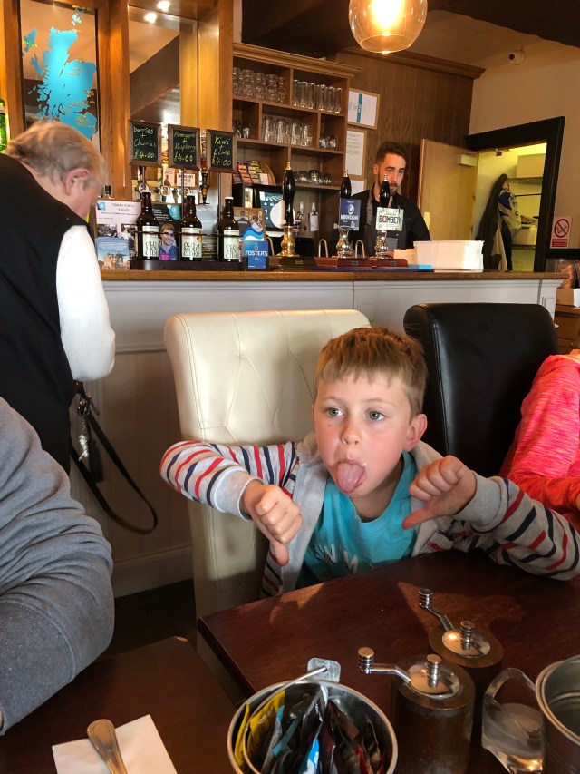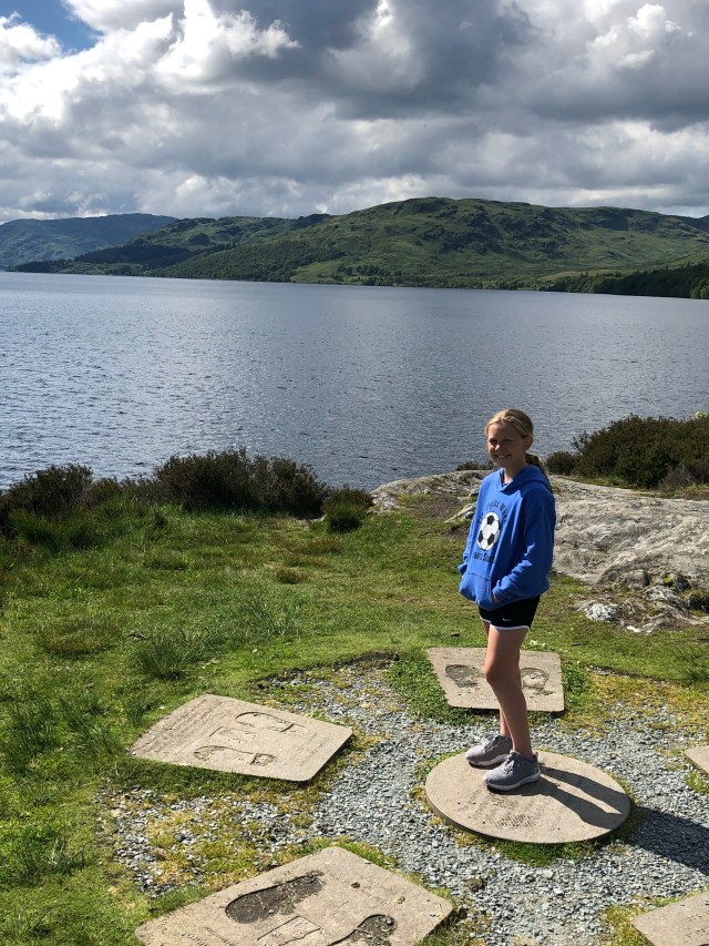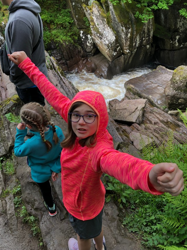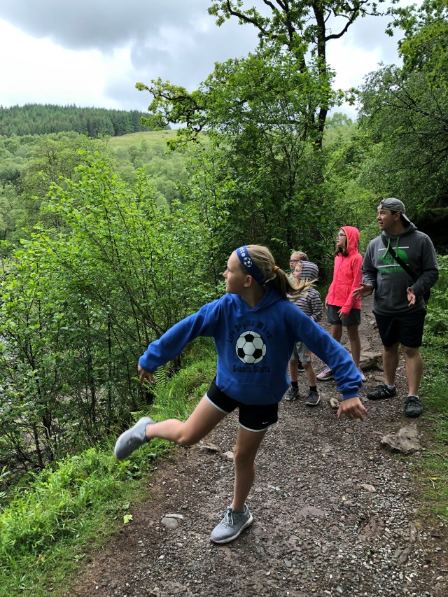 The forecast in Scotland, every single day, was lots of rain and overcast skies. Since we can’t control the weather, we decided to ignore and just do what we wanted, weather be damned. So, the next day we loaded up the kids and our picnic, and drove north to Loch Lomond. It’s a beautiful area that pretty much looks like a postcard in every direction. Once we reached the trailhead for our hike to the Bracklinn Falls, we ate our picnic in the car. Let me just say, in this situation, our children were pigs. There were so many crumbs and so much food all over the van that we could have fed another kid. I was a little afraid to turn it back in, but I guess it’s better than the vomit from England.