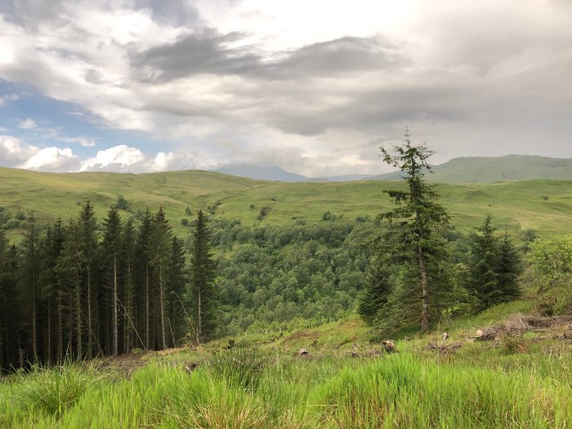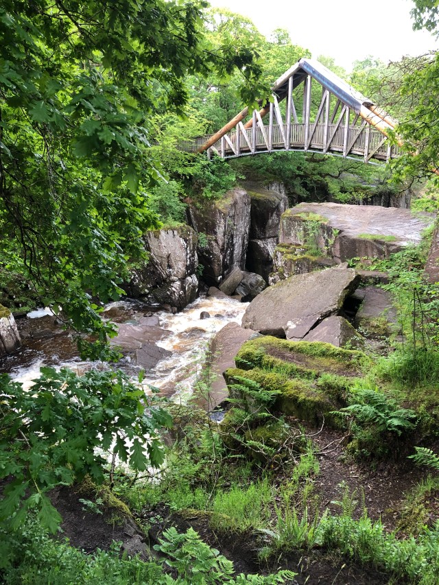 The rain let up as we started our hike, and before long the sun was peeking it’s way through the clouds. What we learned over the course of our visit was that this rain/sun behavior was par for the course (Scotland golf pun). We enjoyed some splendid views of the waterfall, continued our trek up the mountain, walked through an ancient forest, and ended up making a big loop back to the car. At this point I was ready for round two and wanted to move the van a few hundred feet and hike to the Queen’s Jubilee Cairns. I was outvoted.