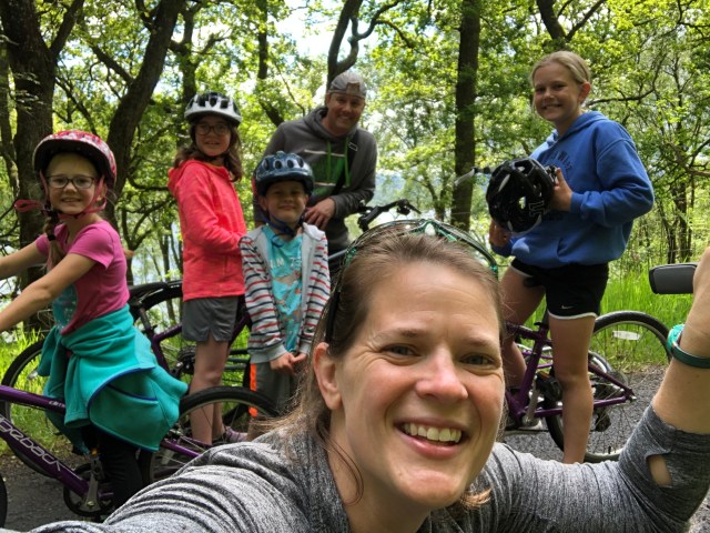 In spite of some hesitation on the part of Katie, we set out on our ride. Everyone was riding well, the views were stunning, and the weather had turned out to be perfect. Everything was awesome – and then Charlie lost control of the bike going down a hill, went down in a heap, and came up with scrapes and tears. In that moment, he was done, but we had to ride back still (about 6 km). I tried the “initially comfort, then ignore/diminish their ailments” strategy, and in hindsight is was pretty successful. He dusted himself off, got back on the bike and continued the journey.