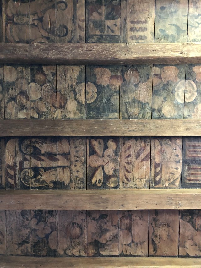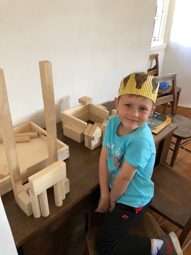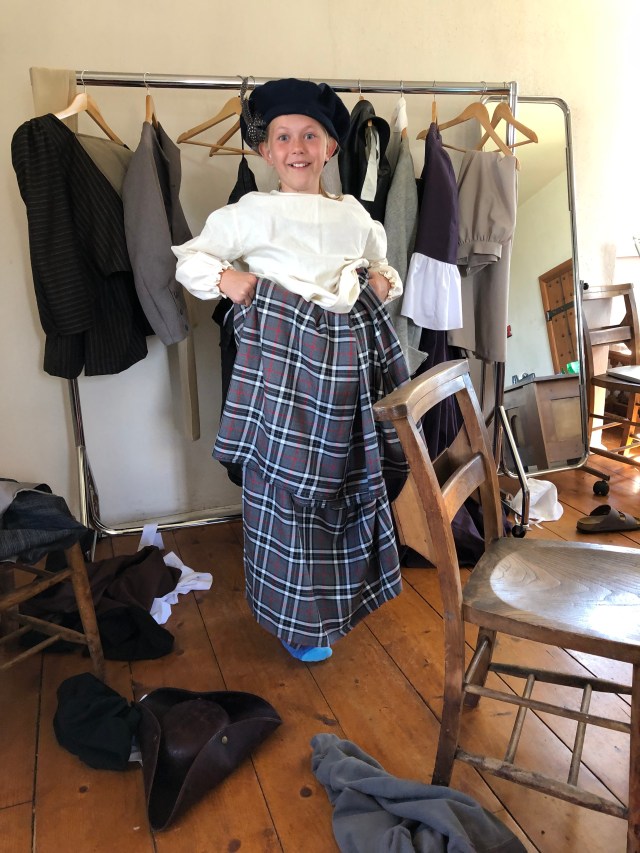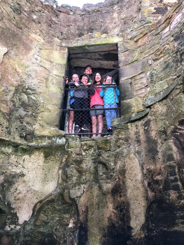 The next morning everyone except Katie decided to walk to the bakery around the corner. We enjoyed some Scottish pastries – the kids passed on sausage rolls and opted for donuts! We took the long route back to our apartment and found a castle in the process! Erik ran back to the apartment to fetch Katie and then we began our exploration. This castle was the Aberdour Castle and the site of filming for a Netflix show “Outlander.” Parts of the castle were restored while other areas were “as is.” The kids really had fun exploring the ruins and grounds. We only saw a handful of people throughout and that just added to the charm! This castle has a beautiful orginal painted ceiling from the early 1600s. The kids enjoyed laying on the floor to gaze up at the painting. They also had a room for dress up and builing castles out of blocks. Juliette attempted to don a kilt but eventually gave up as it was too complicated! Another interesting thing we found was a giant beehive shaped building called a doocot on the grounds that was evidently used for raising pigeons!